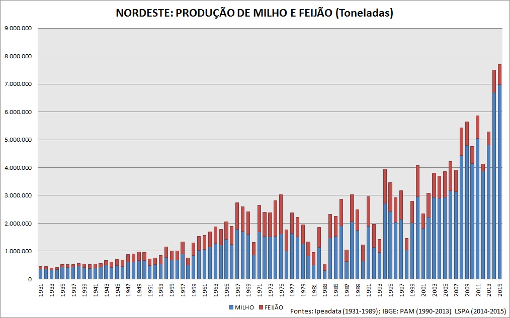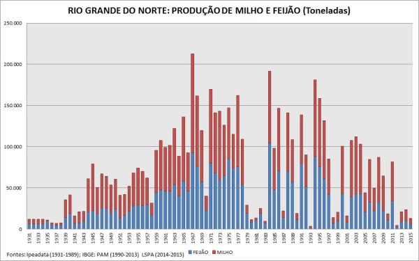 Conforme podemos ver no gráfico abaixo, na década de 30 do século XX a produção somada de milho e feijão no RN era de aproximadamente 13 mil toneladas anuais, com predomínio do feijão. Progressivamente essa produção foi crescendo até atingir uma média de 120 mil toneladas ano nas décadas de 60 e 70 (agora com o milho tendo uma produção ligeiramente maior que o feijão).