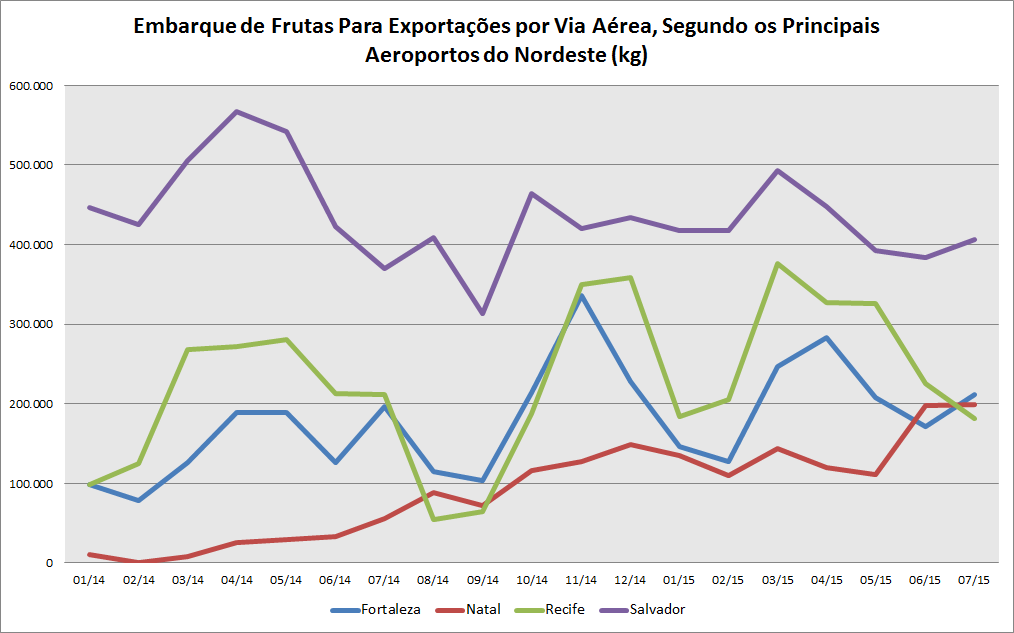 Como resultado desses movimentos, o embarque de frutas por esse aeroporto saltou de um número praticamente inexpressivo no início de 2014 para algo como 200 toneladas/mês agora em julho de 2015.