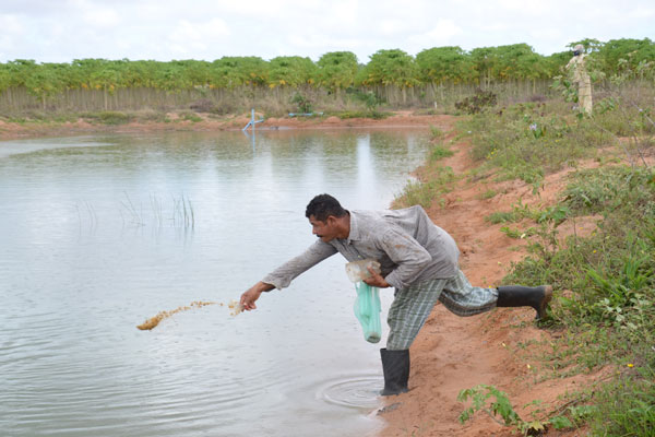Trabalhador assentado alimenta tilápias no RN: Atividade gera água para irrigação e tem planos de alcançar novos mercados. (Foto: Junior Santos)