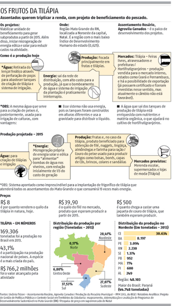 “Oito assentamentos produzem tilápia no Mato Grande. Mas ela é vendida in natura em feiras e a atravessadores. Agregar valor é a melhor opção porque tudo se aproveita no peixe, melhora a renda do produtor e se obtém um produto com maior durabilidade”, diz a assentada e membro da cooperativa dos produtores de Canudos, Livânia Frizon. Apenas no assentamento Rosário, sede da agrovila Canudos, onde vive – a 28 Km da capital, no município de Ceará Mirim – 17 famílias, de um total de 120, aplicaram dinheiro de forma coletiva para produzir peixes e fazer irrigação. O sistema de produção engloba 40 hectares irrigados, com mamão, banana, macaxeira, entre outros produtos. Em meio a eles estão oito viveiros de criação dos pescados.