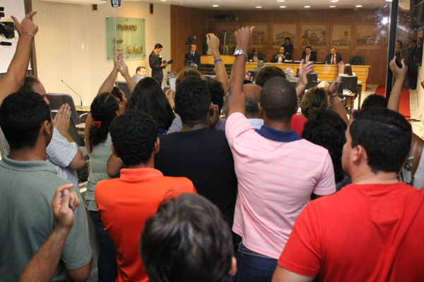 Durante a votação na Câmara Municipal, manifestantes tentam pressionar os vereadores. (Foto: Aldair Dantas)