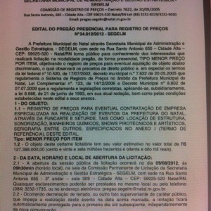 1 de agosto de 2012Deu na editoria Cotidiano do DN online: A respeito de notícias publicadas sobre os valores de licitação a ser feita pela Prefeitura Municipal do Natal, por intermédio da Secretaria Municipal de Turismo e Desenvolvimento Economico (SETURDE) e Fundação Cultural Capitania… [Leia mais]