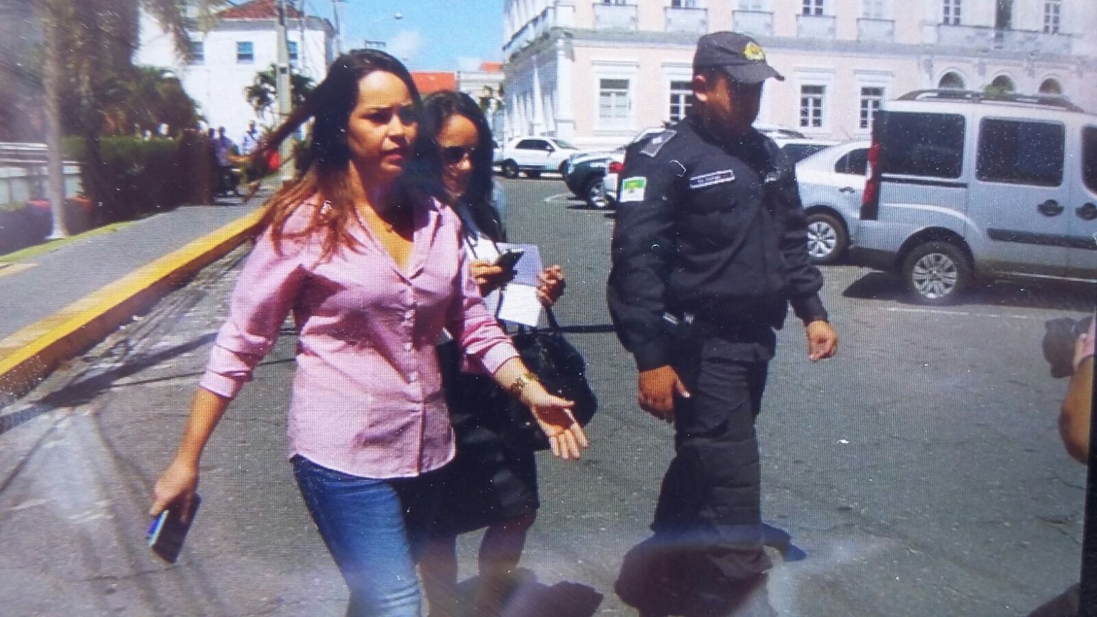 A secretária da Procuradoria da ALRN, Ana Paula Macedo de Moura, conduzida pela polícia. (foto: reprodução Whatsapp)