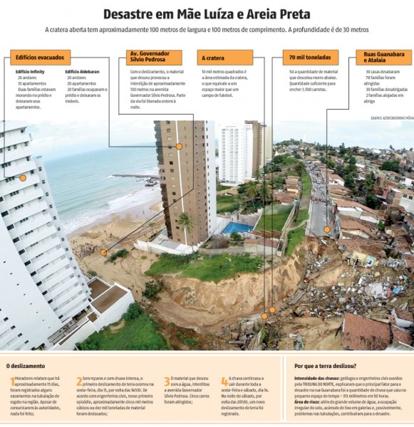 O desastre que abriu uma cratera com mais de dez mil metros quadrados em Mãe Luiza, no último sábado, dia 14, foi provocado por uma série de fatores. Engenheiros civis e geólogos afirmam que o grande volume de água da chuva que caiu nos últimos dias não foi a única razão para o deslizamento de terra, apesar de ser o principal fator para o acidente. Ocupação irregular do terreno, lixo acumulado em sistemas de drenagem e rompimento de tubulações também são apontados como elementos que contribuíram para o episódio que atingiu aproximadamente cem famílias na região.