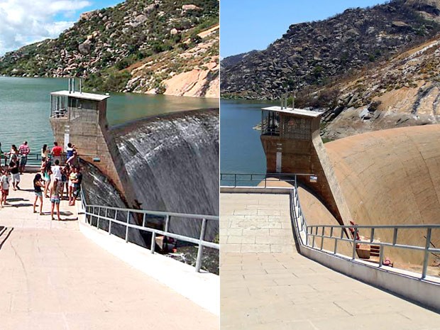 À esquerda, açude Gargalheiras em 2011, quando ainda ocorria a ‘sangria’, a cascata artificial; à esquerda, nos dias atuais, sob a seca (Foto: Canindé Soares e Anderson Barbosa/G1)