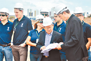 Secretário da Secopa, Demétrio Torres, acompanhando os técnicos da Fifa e do COL na vistoria ao estádio da Copa. (Foto: Fábio Cortez)