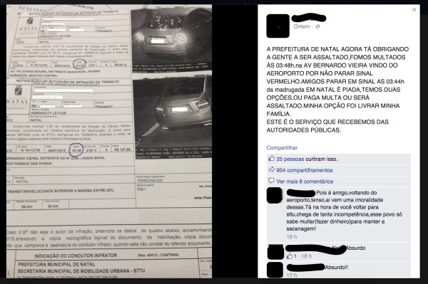 Na imagem abaixo, retirada do Facebook, o autor da foto diz que preferiu arriscar a multa do que colocar a segurança da família em risco, já que as chances de ser assaltado naquela região da cidade de madrugada é bem alto.