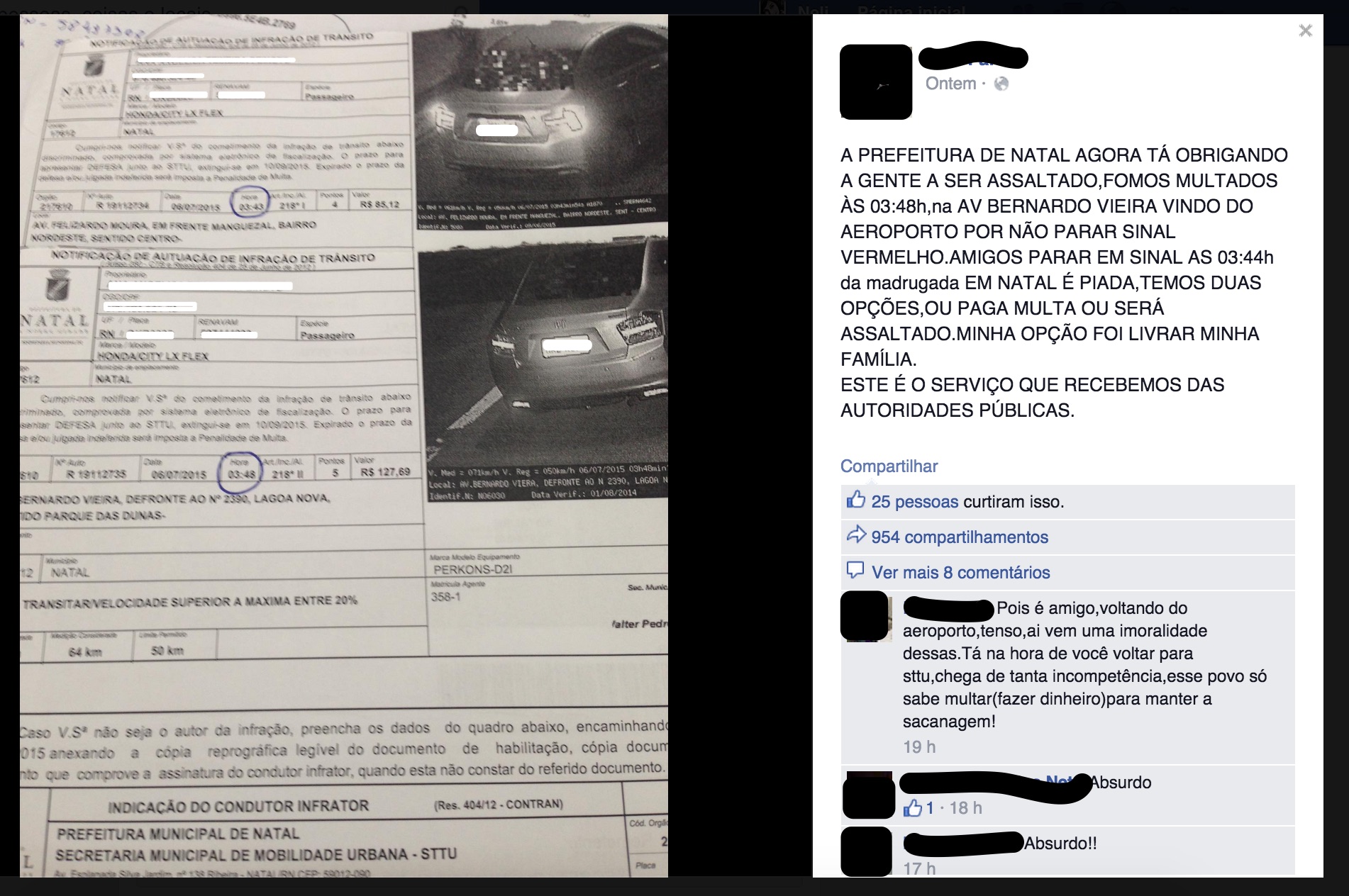Nas redes sociais, reclamações sobre multas por ultrapassar sinais vermelhos durante a madrugada mostram que os níveis de insegurança continuam altos em Natal.