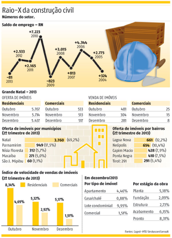 A venda de imóveis na Grande Natal cresceu 19,5% entre o terceiro e o quarto trimestres de 2013, de acordo o Sindicato das Empresas da Construção Civil do Rio Grande do Norte (Sinduscon-RN). Na avaliação do presidente do Sindicato, Arnaldo Gaspar Júnior, o mercado deve permanecer estável este ano, inclusive em relação a abertura de postos de trabalho, apesar do indicativo de queda de 81 vagas no ano passado em relação a 2012. Ele avaliou a queda como “insignificante”.