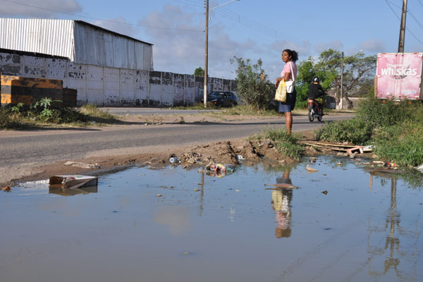 Na avenida Industrial João Mota, na zona oeste da capital, o problema de falta de saneamento também aparece nas ruas. Água servida e esgostos a céu aberto são encontrados diariamente. (Foto: Emanuel Amaral)