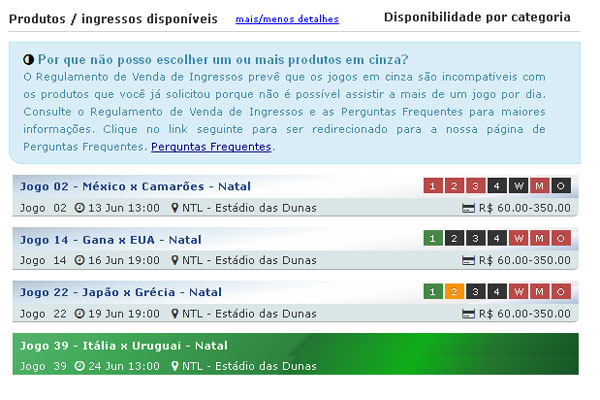 Já para a segunda partida, no dia 16 de junho, onde Gana e Estados Unidos estarão em campo, há “alta disponibilidade” para ingressos na categoria 1, a R$ 350,00, e “baixa disponibilidade” para cadeirantes, obesos e pessoas com dificuldades de locomoção (R$ 180,00).
