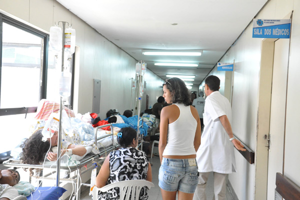 Ontem, os corredores do Hospital Walfredo Gurgel abrigavam 45 pacientes. Transferências para o Huol tiveram início, mas não são suficientes. (Foto: Adriano abreu)