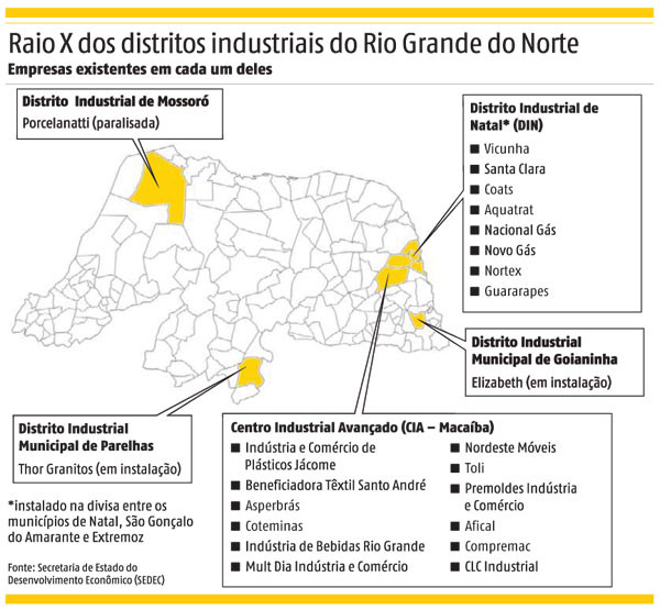 Segundo informações da Secretaria de Estado do Desenvolvimento Econômico (Sedec), atualmente, o estado conta com cinco distritos industriais, sendo dois deles em operação – Macaíba e Natal -, dois em processo de instalação em Goianinha e Parelhas e um paralisado, situado no município de Mossoró.