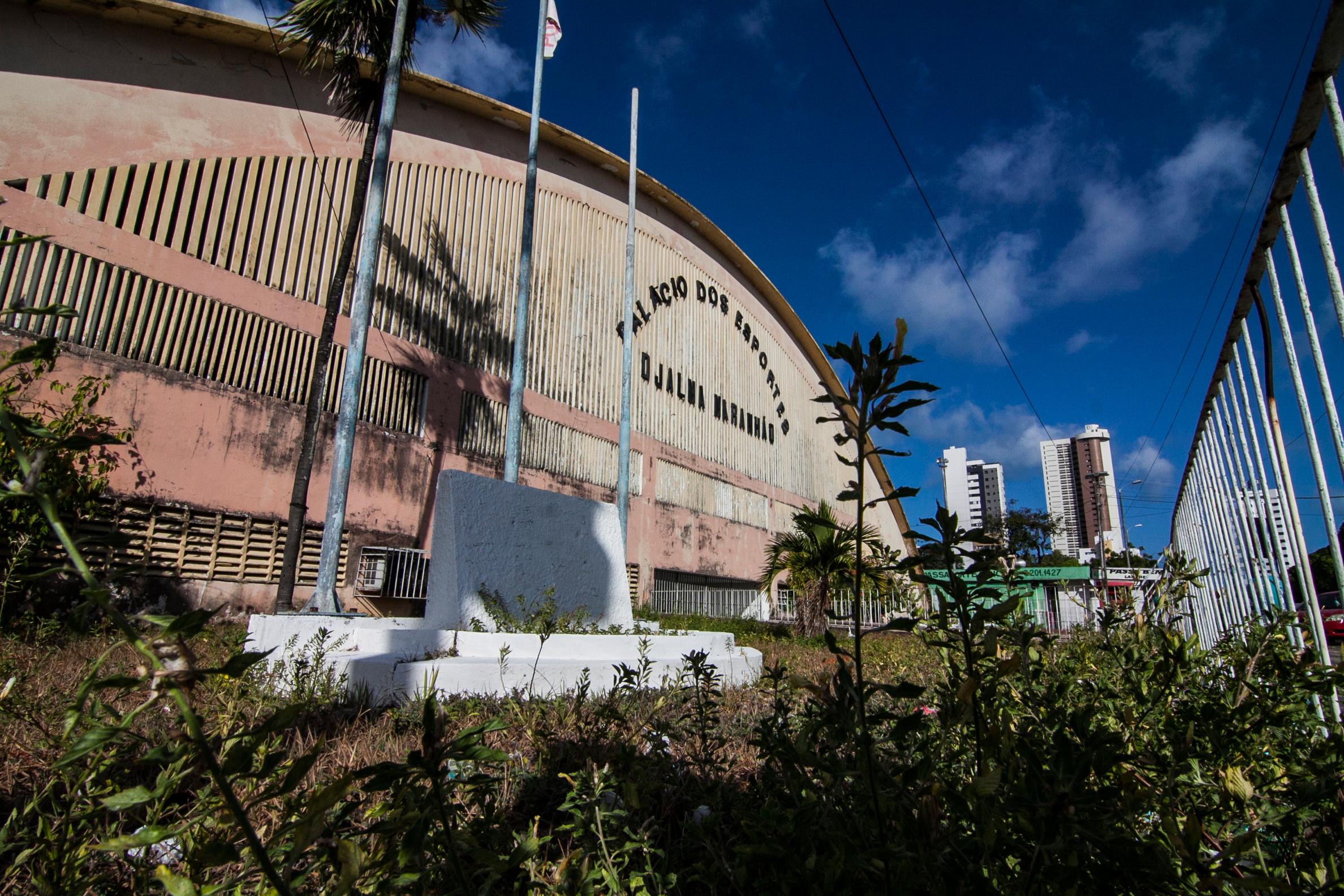 O Palácio dos Esportes está entregue ao descaso do poder público. O lixo e a vegetação alta tomam conta da entrada do local, que não recebe mais jogos. (Foto: Alex Régis)