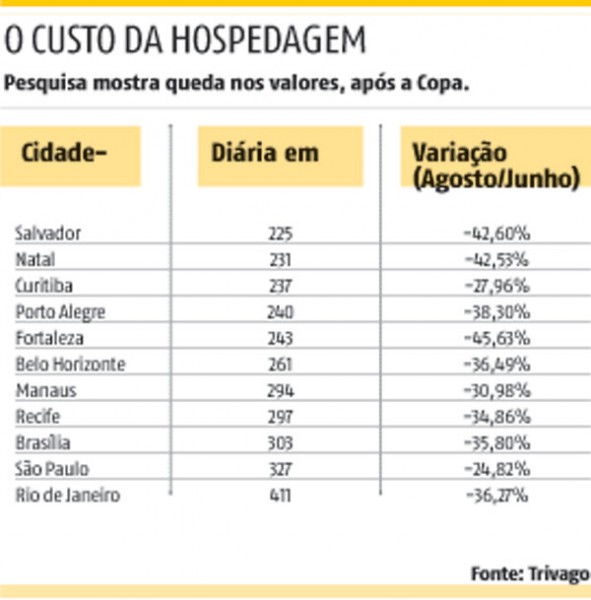 O custo médio da hospedagem nos hotéis de Natal caiu 42,53% em agosto em relação a junho, quando a cidade sediou quatro jogos da Copa do Mundo. A variação é apontada em levantamento divulgado ontem pelo Trivago, site de comparação de preços de hospedagem fundado na Alemanha.