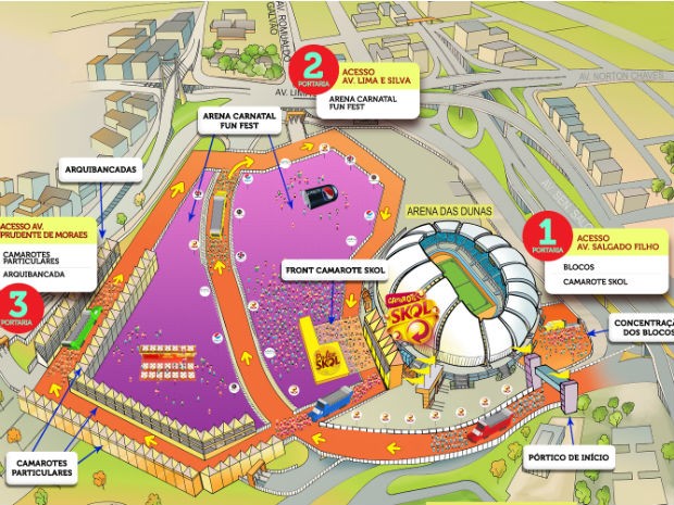 Para quem vai curtir a Arena Carnatal Fun Fest, o acesso será pela Avenida Lima e Silva, na Portaria 2. O espaço terá shows de Saulo Fernandes, Timbalada, Banda Oito7Nove4 e Tuca Fernandes. A Portaria 3, com acesso pela Avenida Prudente de Morais, será a entrada para os camarotes particulares e também para a arquibancada.