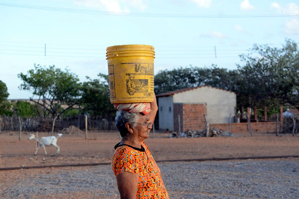 Aos 77 anos, dona Raimunda do Vale Bezerra faz, diariamente, umas seis viagens até a cisterna pra encher a lata d’água que ela leva de volta pra casa equilibrando na cabeça. “É muito sofrida a vida aqui por causa desse problema, mas vai melhorar com o projeto”, diz a senhora.