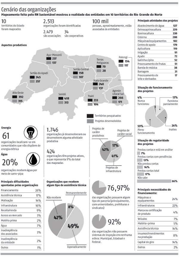 Segundo o mapeamento, há 2.513 organizações sociais e produtivas no RN, sendo 2.479 associações e 34 cooperativas, distribuídas em dez territórios. Deste universo, apenas 424 desenvolvem alguma atividade produtiva atualmente, o que representa 17% do total de organizações mapeadas. Sessenta e uma estão em locais onde não há fornecimento de energia, e a maioria deseja algum financiamento para adquirir máquinas e equipamentos.