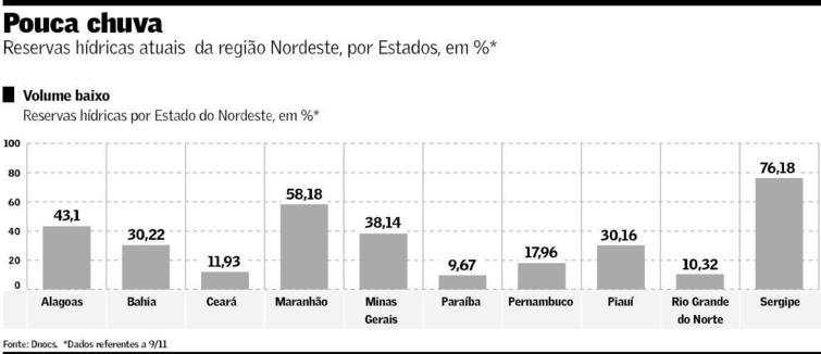 Reportagem publicada hoje no jornal Valor Econômico aponta que os reservatórios no RN que são administrados pelo DNOCS estão com reservas hídricas equivalentes a apenas 10,32% de sua capacidade.
