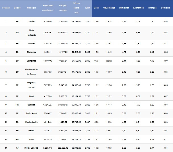 A cidade de Santos, no litoral paulista, é a líder do ranking, apresentando o terceiro melhor Índice de Desenvolvimento Humano Municipal (IDHM) e a sexta maior renda per capita. Santos se destacou no quesito “Educação”, e ficou em segundo lugar em “Saúde”.