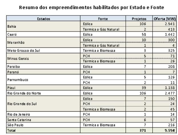 Ao todo, a EPE habilitou 371 projetos, ou 9.594 MW, incluindo além das usinas eólicas 17 Pequenas Centrais Hidrelétricas (184 MW); 13 Termelétricas a Biomassa (612 MW) e 3 Termelétricas a Gás Natural (417 MW).