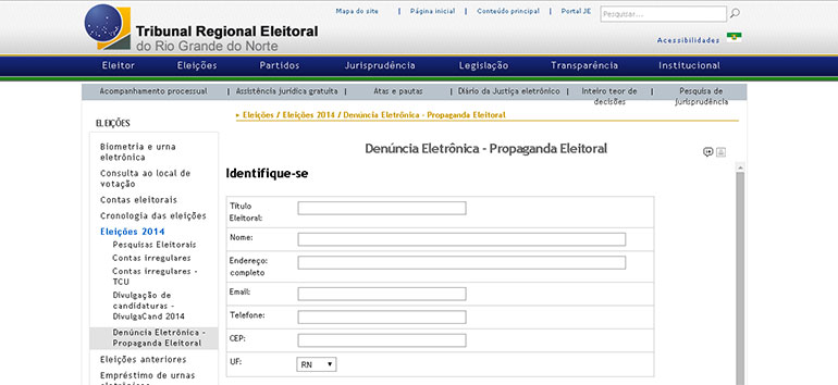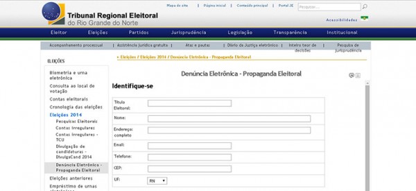 O Tribunal Regional Eleitoral do Rio Grande do Norte (TRE/RN) disponibilizou o sistema que permite ao cidadão fazer denúncias sobre casos de propaganda irregular durante a campanha eleitoral. O sistema está pode ser acessado no site do TRE. De acordo com o TRE, é obrigatória a identificação do denunciante, mas os dados do cidadão ficarão restritos à Justiça Eleitoral e não constarão do expediente instaurado para constatação.